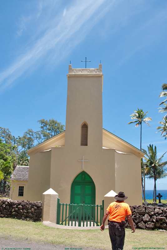 Here under Molokai's sea cliffs, on the secluded Kalaupapa Peninsula, is St.Philomena Church, ministered to by the legendary (and now sainted) Father Damien. He arrived in Kalawao in 1873, and twice enlarged the small wooden church he inherited, with patient/parishioner helpers. The final work was completed after Damien's death in 1889, by Brother Joseph Dutton. Their graves lie just outside the church, where countless others were buried, in cemeteries and thousands of unmarked graves.
